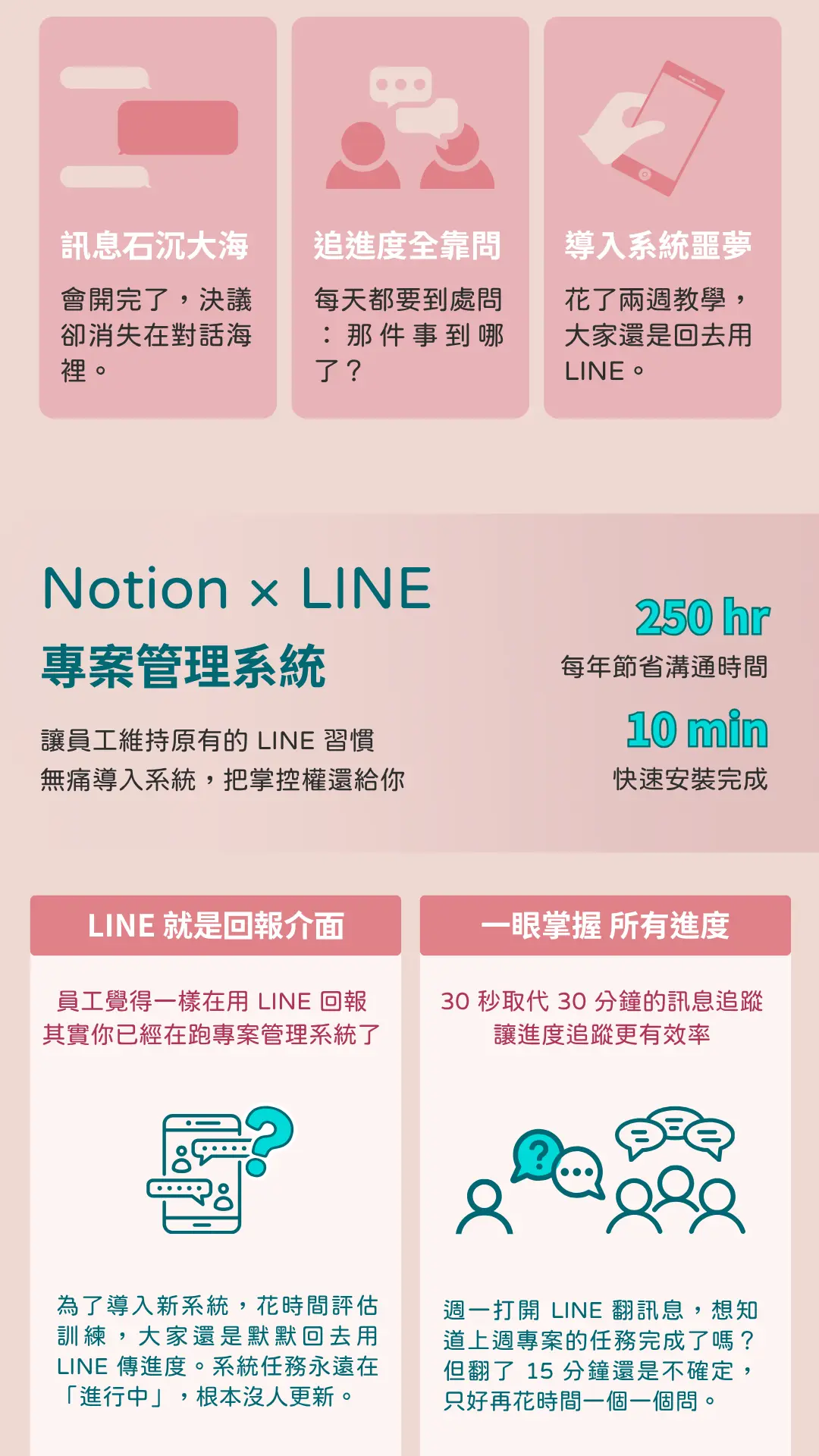 Notion 模板複製到工作區只要 1-2 分鐘。串聯到官方 LINE 大約 10 分鐘即可完成部署,不需要任何工程師。我們提供完整的影片教學,手把手帶你完成設定。